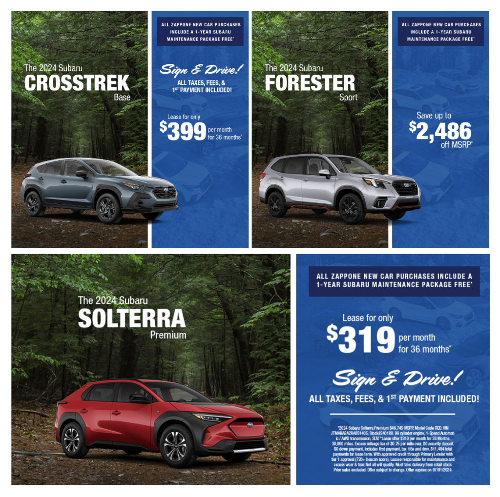 Embrace the spirit of summer adventure with the 2024 Subaru lineup at Zappone Subaru! This June, we’re thrilled to offer exclusive specials on the rugged Crosstrek, versatile Forester, and innovative Solterra. Each model is designed to enhance your outdoor experiences, from mountain trails to coastal highways. Whether you’re seeking efficiency, space, or off-road capability, our Subaru models are equipped to take you further. Dive into our June specials and discover the perfect Subaru to power your summer explorations. Explore our available offers below, choose the right one for you, and schedule your test drive at our dealership in Norwich, NY today!